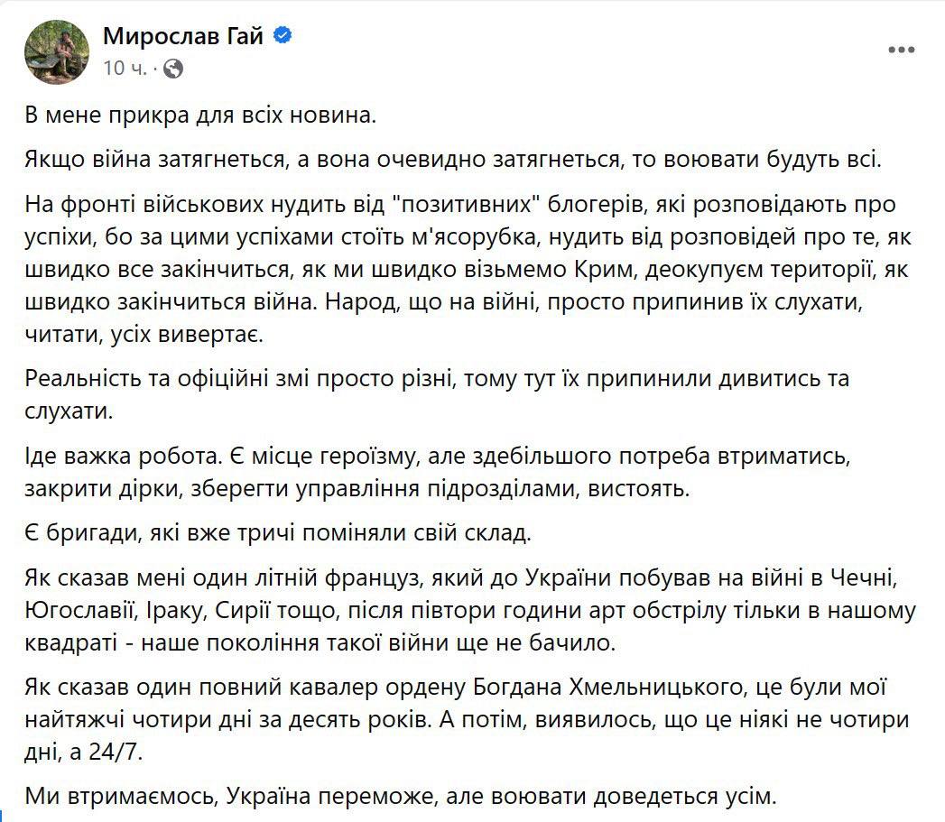 Про те саме написав волонтер, який воює у лавах ЗСУ, Мирослав Гай. "Якщо війна затягнеться, а вона, очевидно, затягнеться, то воюватимуть усі", - пише він.