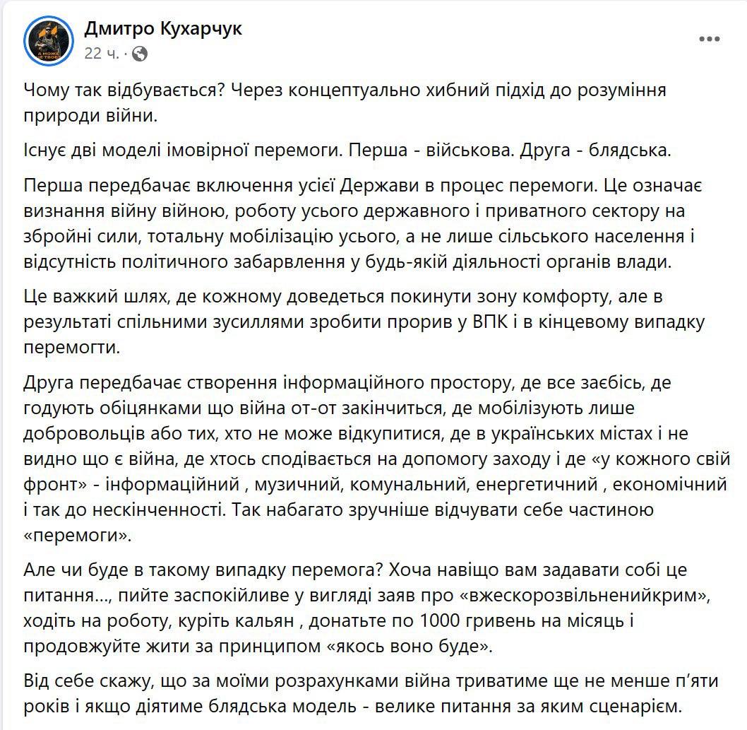 Для військової перемоги потрібно провести "тотальну мобілізацію всього, а не лише сільського населення", пише комбат 3-ї ОШБР Дмитро Кухарчук.