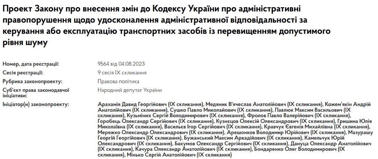 У законопроекті пропонується доповнити Кодекс про адміністративні правопорушення статтею, в якій буде прописано відповідальність за керування транспортними засобами, що перевищує допустимий рівень шуму.