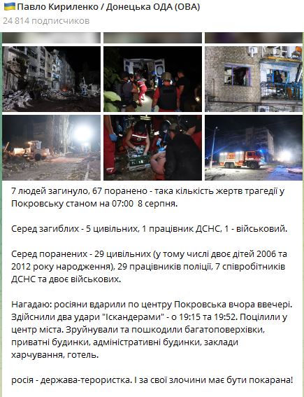 Нагадаємо, що вчора ввечері по центру міста росіяни завдали двох ударів "Іскандерами". Зробили два удари "Іскандерами" - о 19:15 та 19:52. Зруйнували та пошкодили багатоповерхівки, приватні будинки, адміністративні будинки, заклади харчування, готель.