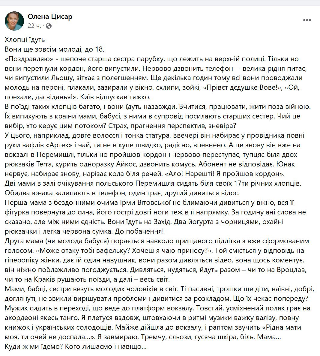 "У поїзді таких хлопців багато, і вони їдуть назавжди. Вчитися, працювати, жити поза війною. Їх виштовхують із країни мами, бабусі, з ними у супровід посилають старших сестер. Чий це вибір, хто керує цим потоком? Страх, прагнення до перспектив", зневіра?", - пише автор поста.