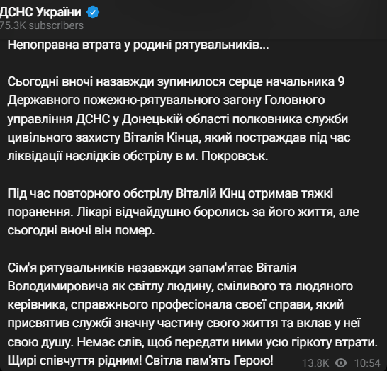 Сьогодні у лікарні помер начальник дев'ятого державного пожежно-рятувального загону Головного управління ДСНС Донецької області, полковник служби цивільного захисту Віталій Кінц, який отримав поранення під час ліквідації наслідків обстрілів у Покровську 7 серпня.