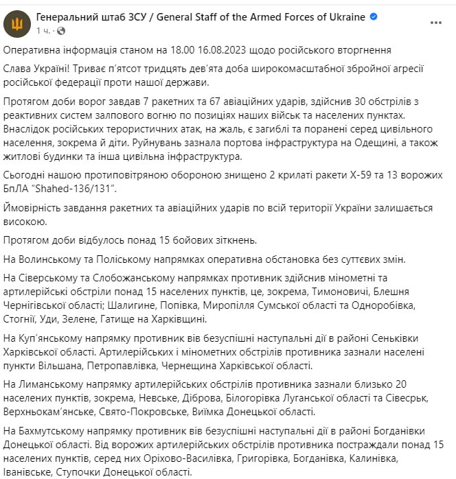Війна в Україні триває вже 539-й день. Ми стежимо за останніми новинами та ключовими подіями 16 серпня 2023 року в онлайні .
