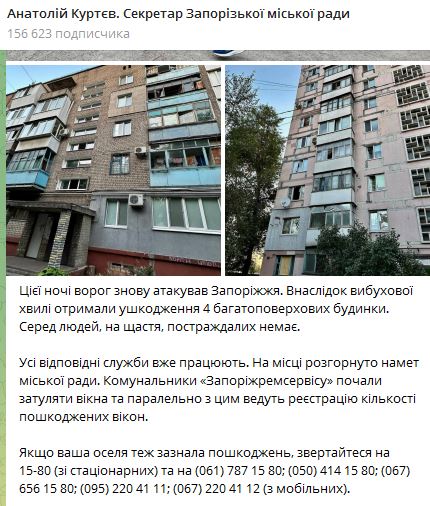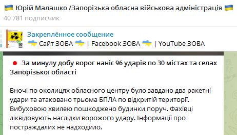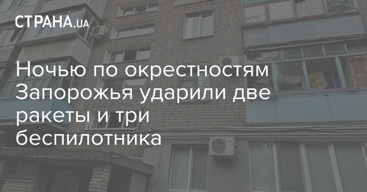 Поданим глави Запорізької ОВА, вночі по околицях Запоріжжя було завдано двох ракетних ударів і атаки трьома БПЛА по відкритій території. Вибуховою хвилею пошкоджено будинки поряд. Фахівці усувають наслідки ворожого удару. Інформація про постраждалих не надходила.