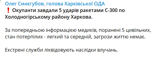 13:26 Глава ОВА Олег Синегубов повідомив, що було завдано 5 ударів ракетами С-300 по Холодногірському району Харкова.