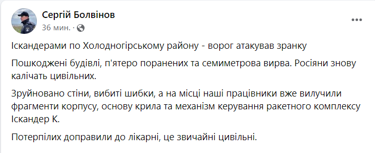 За його словами, на одному з місць влучень утворилася семиметрова вирва, пошкоджено будинки, зруйновано стіни, вибито скло: "На місці наші працівники вже вилучили фрагменти корпусу, основу крила та механізм управління ракетного комплексу "Іскандер К".