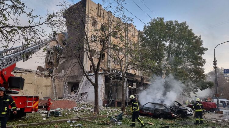 У МВС заявляють, що це є наслідок падіння уламків ракети. На фото та відео помітно, що руйнування у будівлі дуже серйозні.