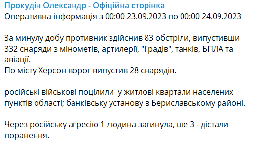 "Російські військові потрапили до житлових кварталів населених пунктів області; банківської установи в Бериславському районі", - написав глава ОВА.