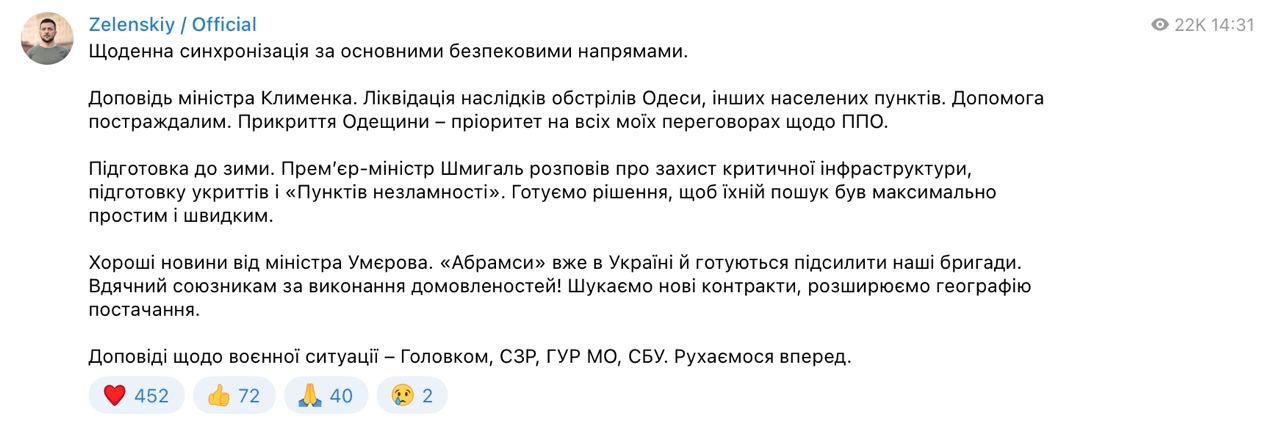 1. Повідомив, що перші танки Abrams вже в Україні. Працюють над далекобійною зброєю та збільшенням систем ППО.