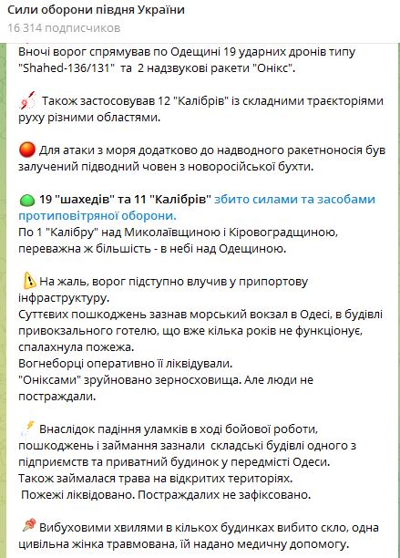 07.15 Сили оборони півдня України повідомляють, що вночі росіяни направив по Одеській області 19 ударних дронів типу "Shahed-136/131" та дві надзвукові ракети "Онікс".