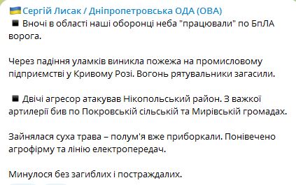 07.34 Вночі через запад уламків збитого російського дрону виникла пожежа на промисловому підприємстві в Кривому Розі.