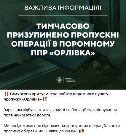 У вівторок, 26 вересня, після удару РФ тимчасово призупинено роботу поромного пункту пропуску "Орлівка" на кордоні з Румунією.