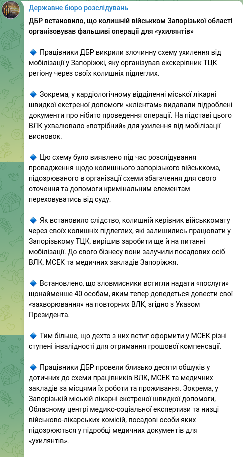 Ця схема була виявлена під час розслідування у справі колишнього запорізького військкома, підозрюваного в організації нелегального збагачення для себе та свого оточення, у тому числі допомоги кримінальним елементам у приховуванні від суду.