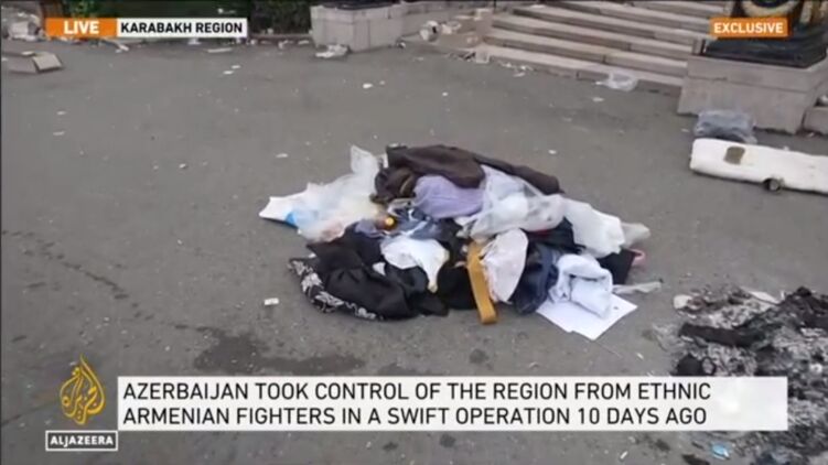 На кадрах телеканалу Al Jazeera зі Степанакерта видно порожню центральну площу, завалену сміттям, покинутими дитячими колясками та самокатами.