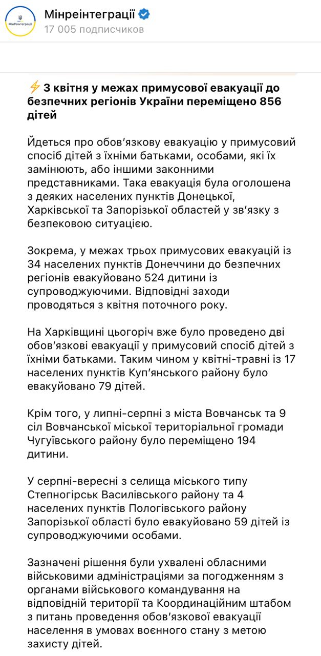 З квітня з прифронтових регіонів примусово переселили у безпечніші місця проживання 856 дітей.