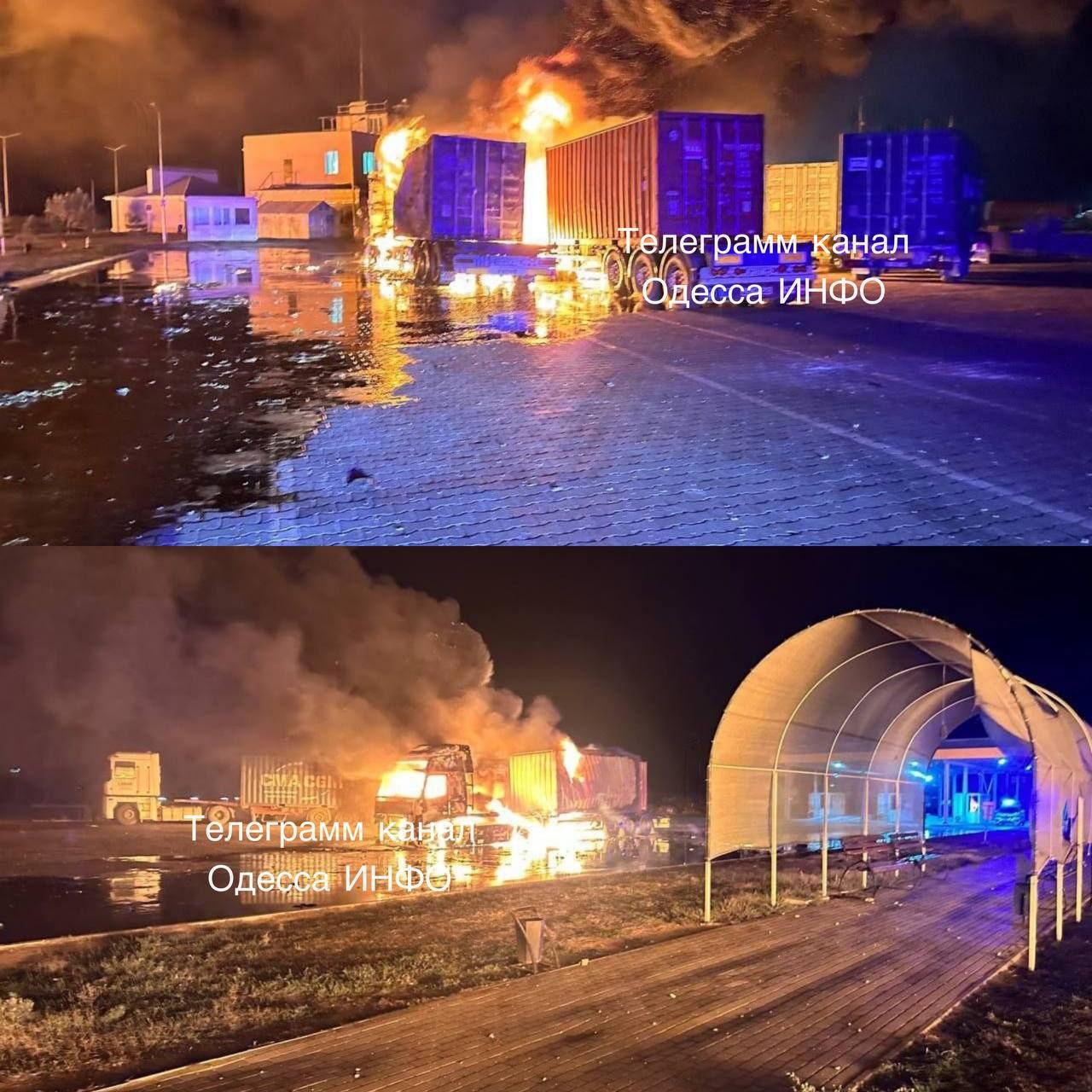 У мережі публікують фото та відео наслідків нічної атаки дронів Орловкою в районі Рені. На них видно фури, що горять.