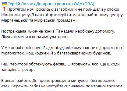 07.40 Вночі РФ вдарила з важкої артилерії по Нікопольському району – Дніпропетровській області – Марганецькій та Мирівській громадах.