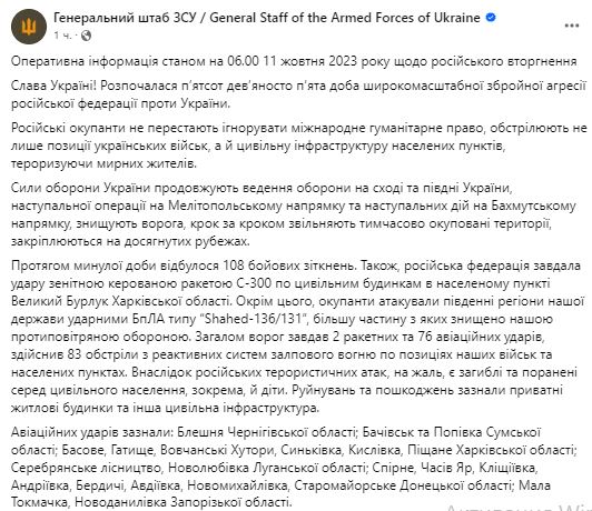 Генштаб ЗСУ оприлюднив зведення про ситуацію на фронті на ранок 11 жовтня.