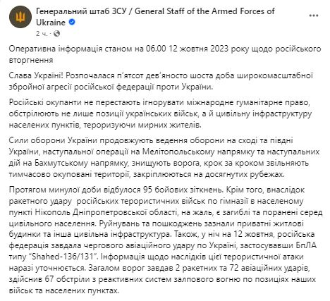 Вранці 12 жовтня Генштаб ЗСУ оприлюднив зведення про ситуацію на фронті.
