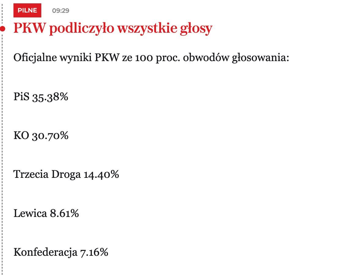 Таким чином, у опозиційних партій на трьох - 53,71%. У правлячої ПіС та правих - 42,54%. Колишній голова Євроради Дональд Туск формуватиме уряд.