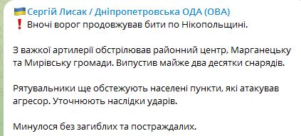 Вночі РФ із важкої артилерії вдарила по Нікопольщині.