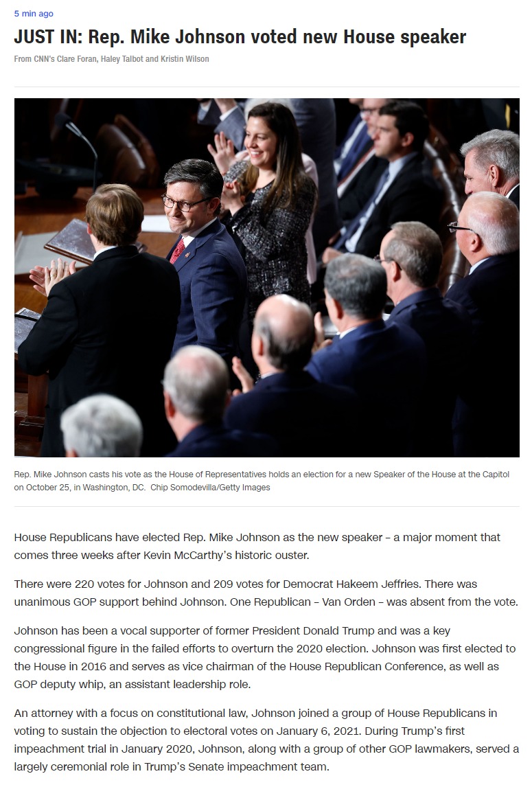За 51-річного Джонсона з першого разу проголосували усі 220 присутніх республіканців. Один республіканець Ван Орден був відсутній на голосуванні. При цьому 209 голосів було віддано за демократа Хакіма Джефріса.