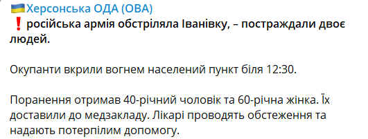 "Окупанти покрили вогнем населений пункт близько 12:30. Поранення отримали 40-річний чоловік та 60-річна жінка. Їх доставили до медустанови. Лікарі проводять обстеження та надають постраждалим допомогу", - йдеться у повідомленні.