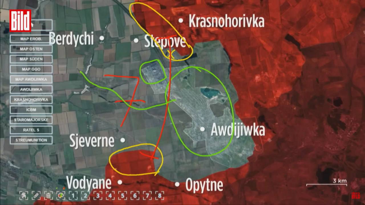 Він повідомляє, що російські війська вийшли до залізничної гілки на півночі міста та підійшли до села Північне на півдні. В результаті ширина коридору, яким може забезпечуватися угруповання ЗСУ в Авдіївці, скоротилася з 9 до 7 км.