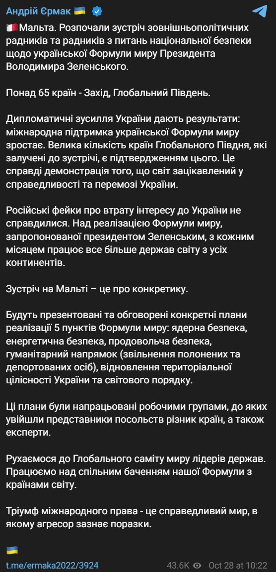 Сьогодні, 28 жовтня, на Мальті стартував третій мирний саміт щодо України, на якому присутні представники понад 65 країн.