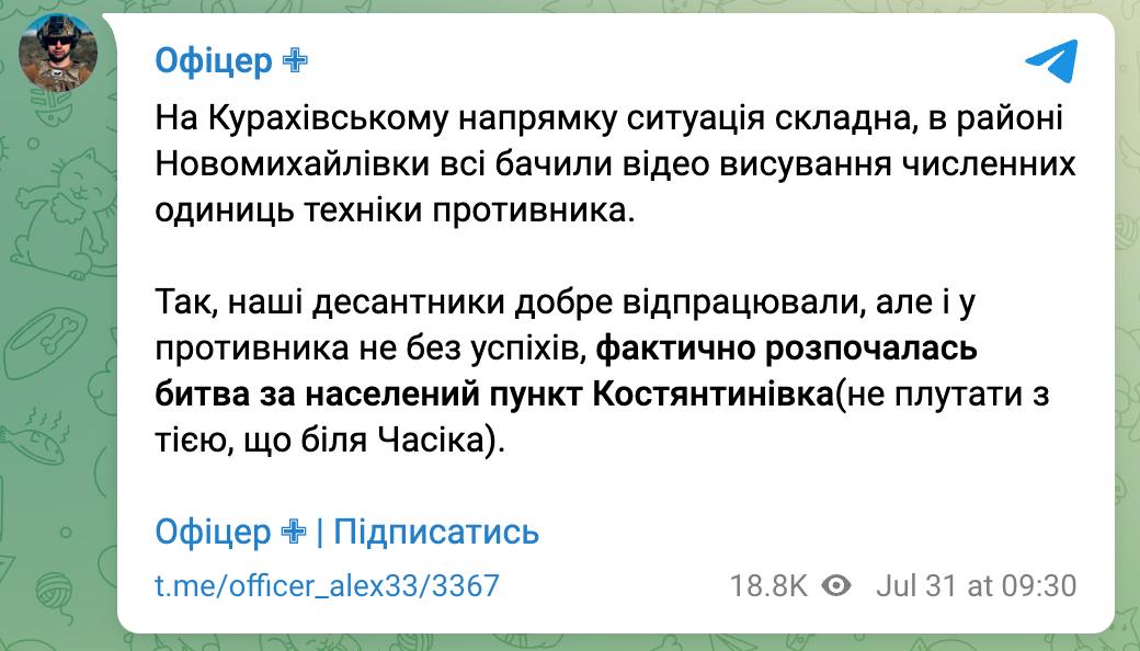 Росіяни змогли просунутися у бік Костянтинівки, що на Курахівському напрямі. Про це заявляє офіцер ЗСУ із позивним "Алекс".