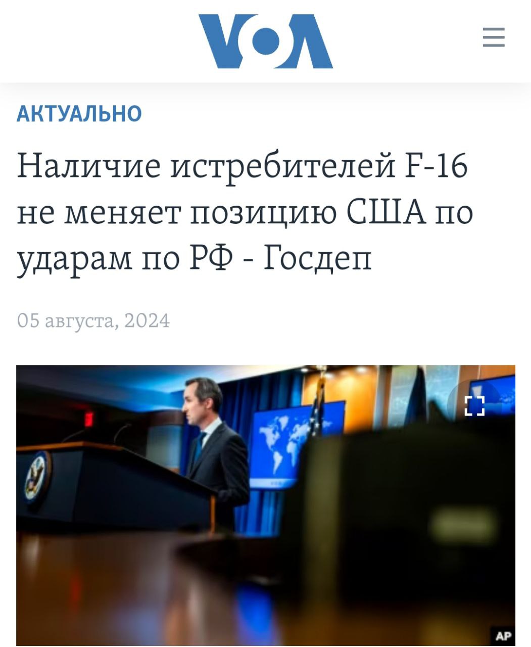 Поява винищувачів F-16 в Україні не змінює позицію США щодо ударів углиб Росії - Держдеп