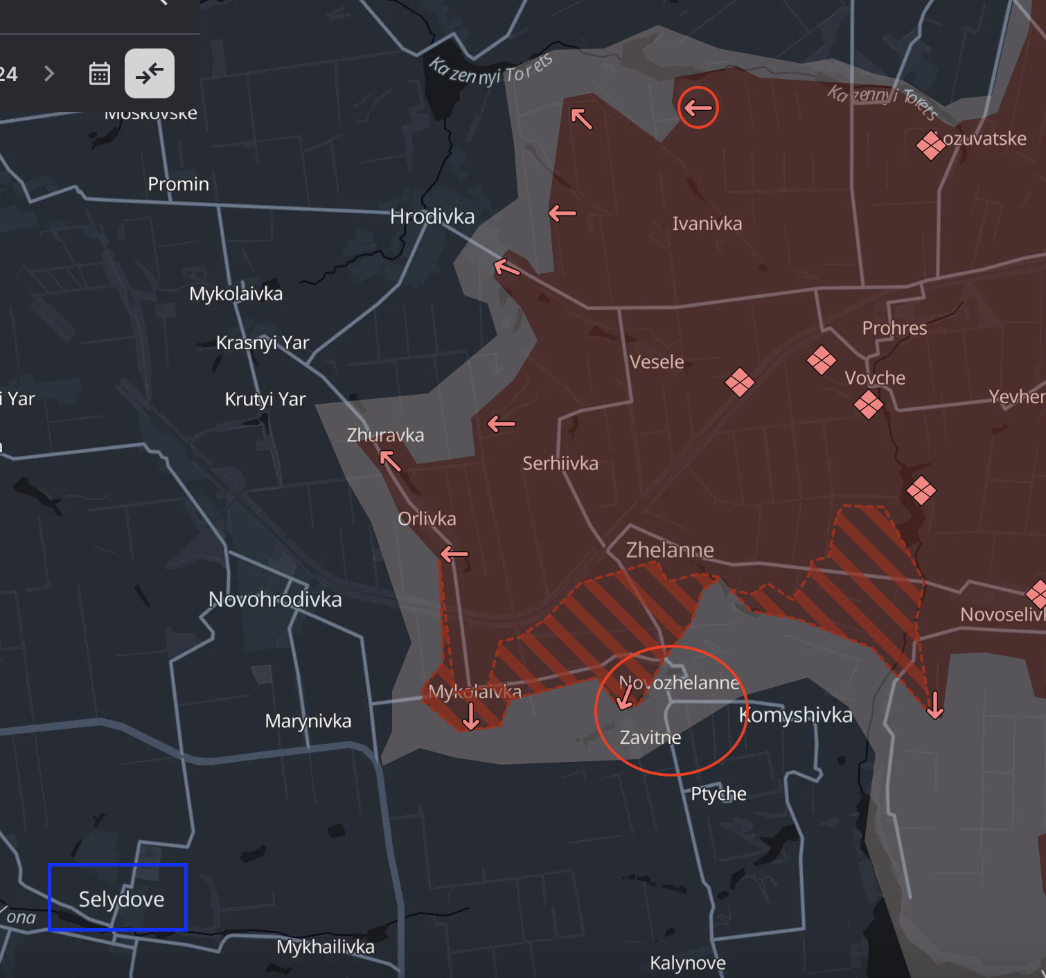 Рух на Новогродівку і особливо Селидово підтверджує версію "Країни", що наступ РФ на покровському напрямку, який зараз йде більше не на захід, у бік Мирнограда та Покровська, а на південний захід, глобально у напрямку Врем'євського виступу, має на меті обійти із заходу другу лінію української оборони на всьому донецькому фронті від Очеретиного до Вугледару.