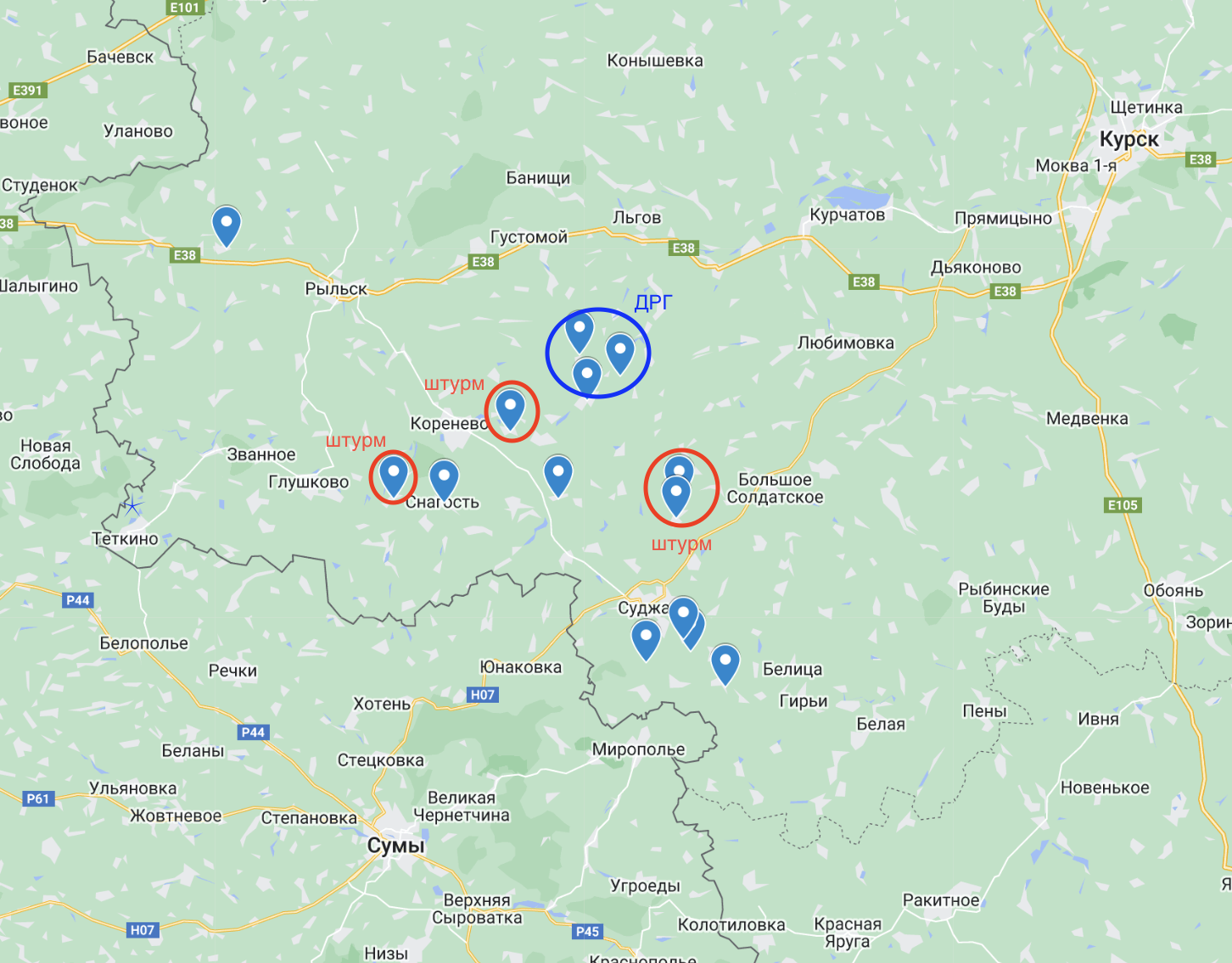 Коментуючи ситуацію під Курськом, російське міноборони сьогодні заявило, що йде пошук українських ДРГ на південь від населених пунктів Олексіївське, Сафонівка та Шептухівка (синє коло на карті). А штурми відбивались у напрямку сіл Комарівка, Ольгівка, Російське та Черкаське Порічне (червоні кола на карті).