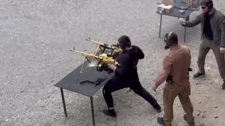 На кадрах молодик тримає в кожній руці автоматичну зброю золотого кольору і водночас веде вогонь. Мішеней на записі не видно. Поруч стоять кілька чоловіків. Один із них тримає камеру та знімає те, що відбувається.