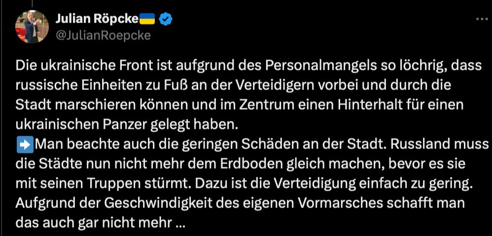 "Росії більше не потрібно зносити міста із землею, перш ніж штурмувати їх своїми військами. Захист просто занадто слабкий для цього. Через швидкість вашого власного просування ви більше не можете цього робити", - заявив Рєпке, наводячи приклад відео бою з українською. танком у невстановленому населеному пункті.