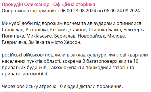 08:00 На Херсонщині внаслідок російських обстрілів 10 людей отримали поранення. Про це повідомляє голова Херсонської ОВ Олександр Прокудін.
