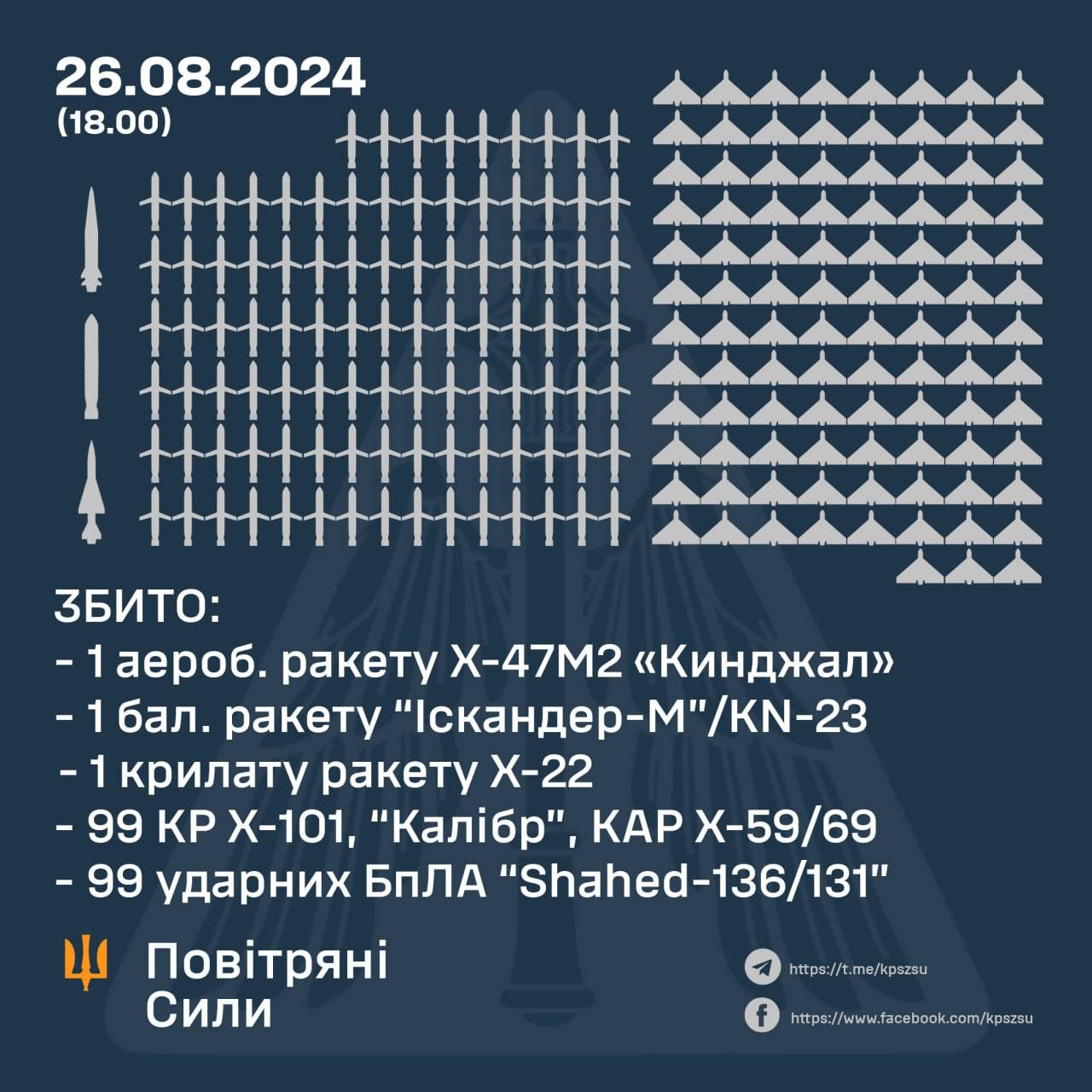 Зі 127 ракет і 109 "Шахедів", запущених сьогодні військами РФ по Україні, було збито 102 ракети та 99 дронів.