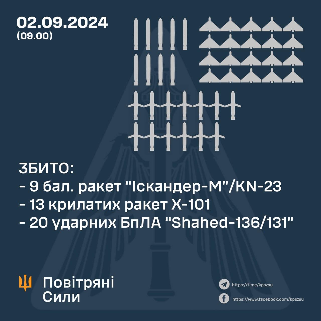 9.28 Повітряні сили повідомляють, що вночі збили 22 ракети із 35, а також 20 «Шахедів» із 23.