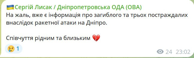 23.05 У Дніпрі один загиблий і троє поранених внаслідок ракетного удару, повідомив голова ОВА Лисак.