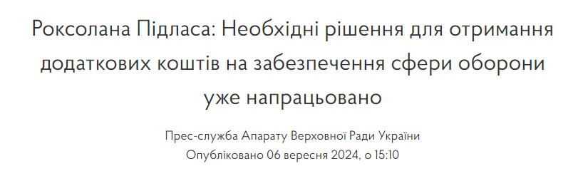 "У Міноборони нам кажуть, що вони не мають грошей на виплати військовим до 20 вересня. Але ми проголосуємо за зміни до держбюджету до 20 вересня. Я не можу зараз назвати дату засідання Верховної Ради, але приблизно 17-18 вересня ми очікуємо на це голосування", – запевнила Підласа.