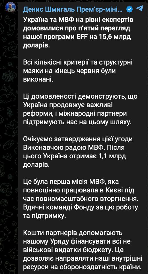 08:37 Україна та МВФ дійшли угоди про продовження кредитної програми EFF на 15,6 млрд доларів. Якщо її затвердить виконавча рада Фонду, Україна отримає 1,1 млрд. доларів.