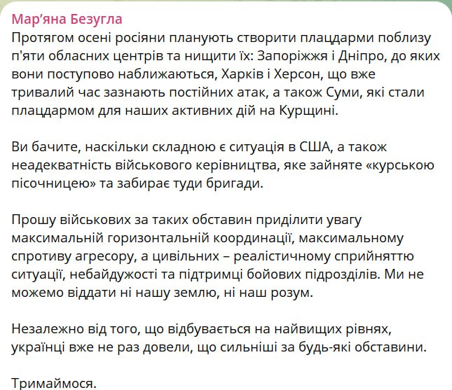 При цьому, посилаючись на "неадекватність військового керівництва, яке зайняте "курською пісочницею" і забирає туди бригади", Безугла закликала "військових за таких обставин приділити увагу максимальній горизонтальній координації", тобто погодити дії без вищого керівництва.