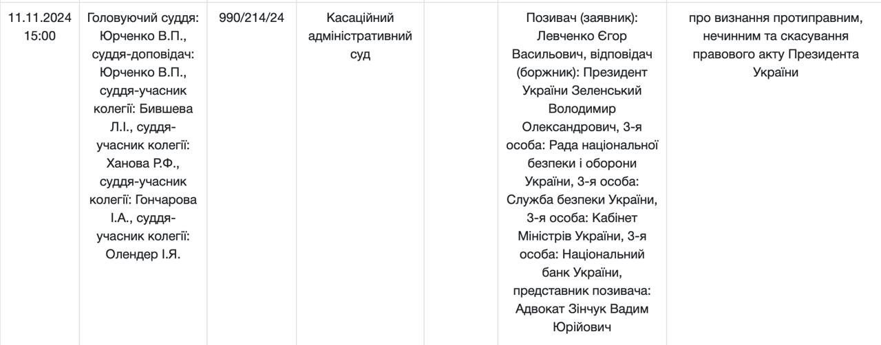 Зокрема, у справі голови ради оборони Дніпропетровської області Геннадія Корбана, який хоче заперечити указ про позбавлення його громадянства України, а також у справі екс-нардепа Андрія Деркача, який вимагає скасувати санкції, запроваджені Зеленським у 2021 році.