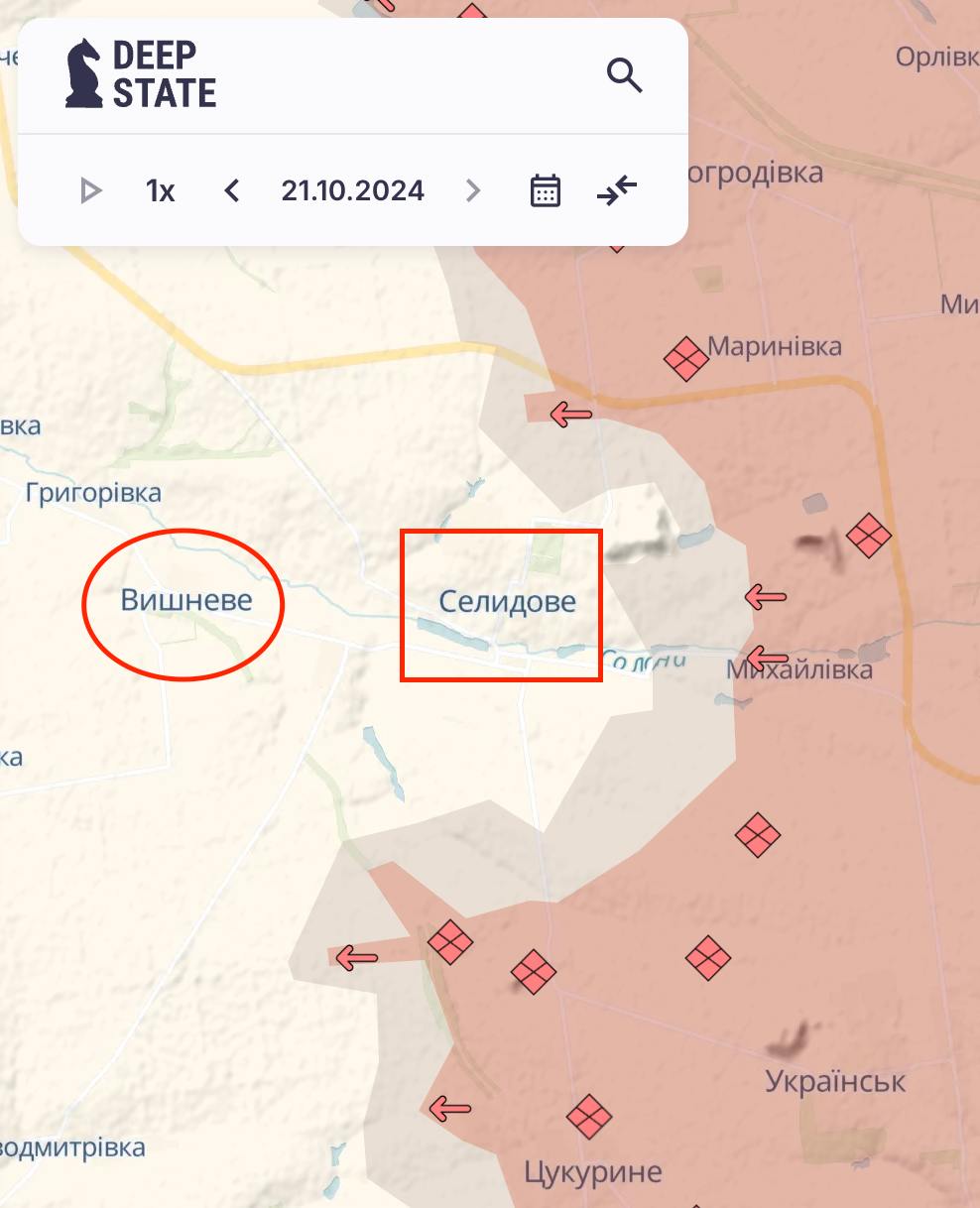 Також "Мучний" підтверджує дані російських пабліків, що вже йдуть штурми Вишневого на захід від Селідового, щоб відрізати місто від Покровська. Карта Deep State поки що дає картину станом на вчора і не відображає цих даних. При цьому захоплення Вишневого допоможе РФ встановити щільніший вогневий контроль над дорогою в Покровськ - єдиною вільною трасою з Селидово.