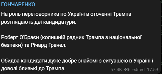 Народний депутат Олексій Гончаренко пише, що на це місце розглядаються колишній радник Трампа з нацбезпеки Роберт О'Брайєн та колишній в.о. директора нацрозвідки Річард Гренелл.