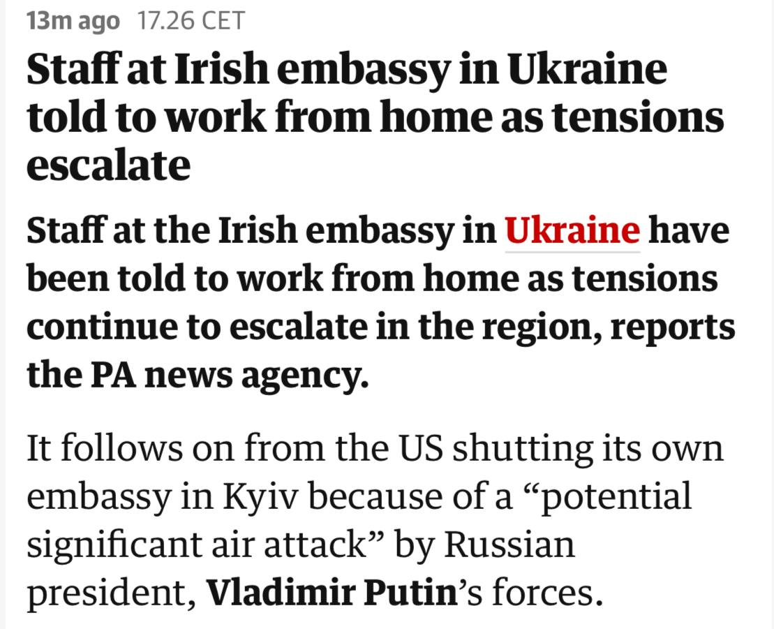 Співробітникам посольства Ірландії в Україні наказано працювати на віддаленні через зростання напруженості у регіоні.