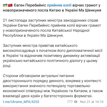 Заступник міністра закордонних справ України Євген Перебійніс прийняв копії вірчих грамот у новопризначеного посла Китаю в Україні Ма Шенкуня.