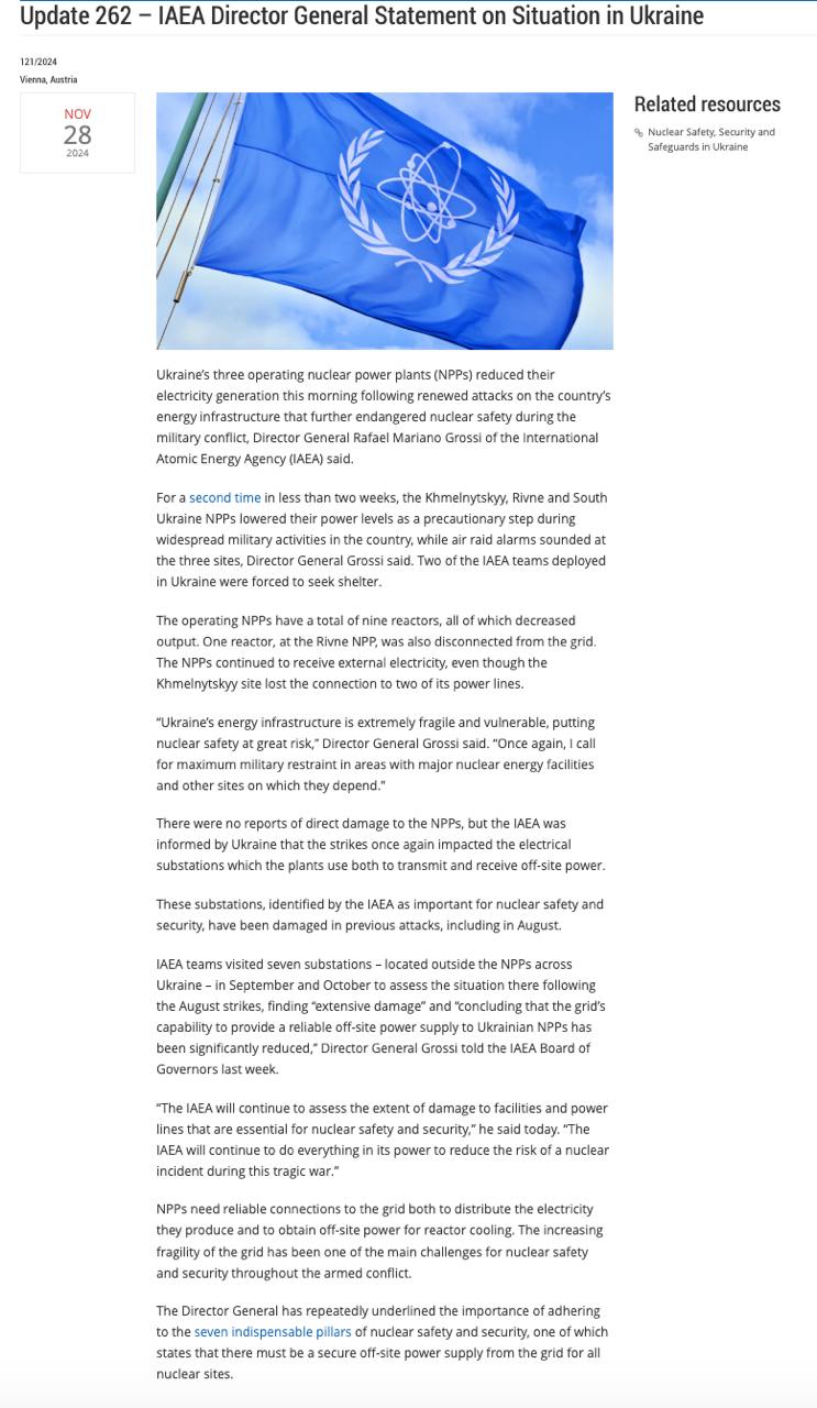 "Україна поінформувала МАГАТЕ про те, що удари вкотре торкнулися електричних підстанцій, які [атомні] станції використовують як для передачі, так і для прийому електроенергії", - повідомляє агентство.