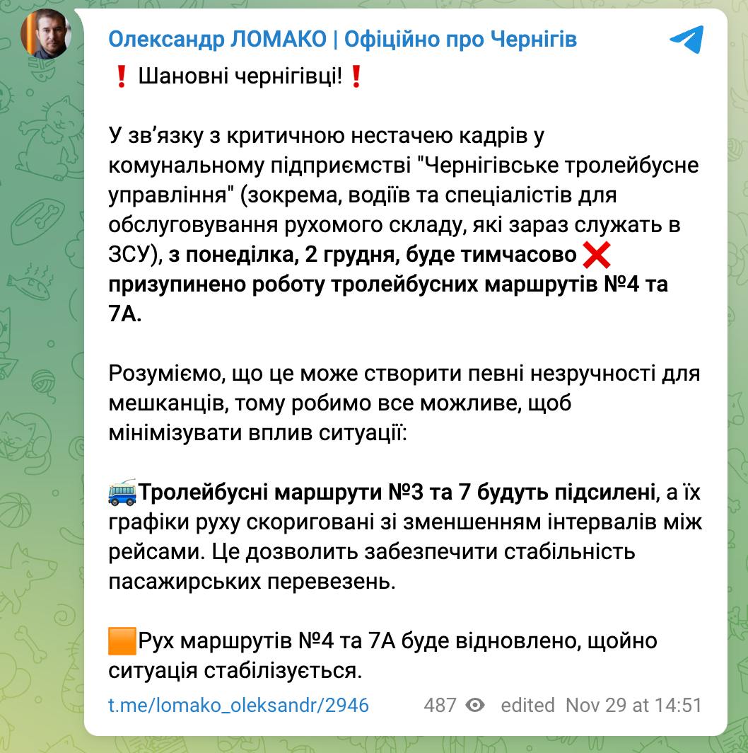 15:05 У Чернігові через брак водіїв зупинили роботу двох тролейбусних маршрутів, повідомляє в.о. мера міста Олександр Ломако.