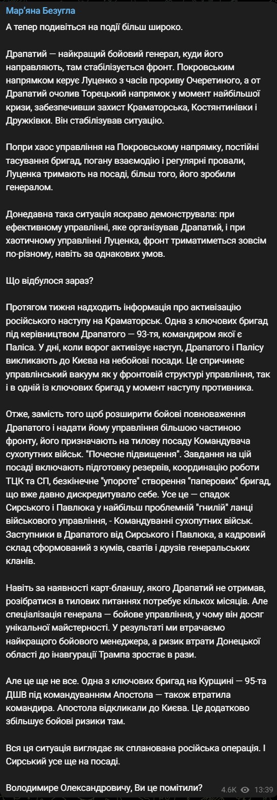 "Протягом тижня надходить інформація про активізацію російського наступу на Краматорськ. Одна з ключових бригад під керівництвом Драпатого - 93-та, командиром якої є Паліса. У дні, коли ворог активізує наступ, Драпатого та Паліс призначають до Києва на небойові посади. Це тягне за собою. за собою управлінський вакуум як у фронтовій структурі управління, так і в одній із ключових бригад у момент наступу супротивника. Отже, замість того, щоб розширити бойові повноваження Драпатого і надати йому управління більшою частиною фронту, його призначають на тилову посаду Командуючого сухопутними військами. упокорене" створення "паперових" бригад, що вже давно дискредитувало себе. Заступники у Драпатого від Сирського та Павлюка, а кадровий склад сформований з кумів, сватів та друзів генеральських кланів. Але спеціалізація генерала - бойове управління, в чому він досяг унікальної майстерності. В результаті ми втрачаємо найкращого бойового менеджера, а ризик втрати Донецької області в інавгурацію Трампа зростає у рази", - пише Безугла.